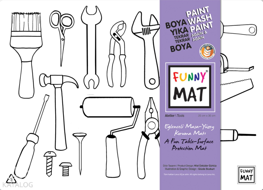 Funny Mat, 25x35 cm ölçüsünde her türlü etkinlik sırasında masa ve yüzey koruyucu olarak kullanılabilen bir üründür. Üzerinde yemek yenebilir, kil ve oyun hamuru ile oyun oynanabilir, ders çalışılabilir, boyama yapılabilir… Kendisi de bir etkinlik materyali olan Funny Mat'ın üzerindeki desenler hem keçeli kalemlerle hem de kuru boyalarla istenildiği gibi renklendirilebilir ve çocuklar bu sayede yaratıcılıklarını geliştirebilirler. Suyun altına tutulduğunda veya ıslak mendille silindiğinde kolaylıkla temizlenen Funny Mat, defalarca renklendirme ve aynı ürünü farklı amaçlarla kullanma imkânı vererek bütçe dostu bir ürün olma özelliği de taşımaktadır.