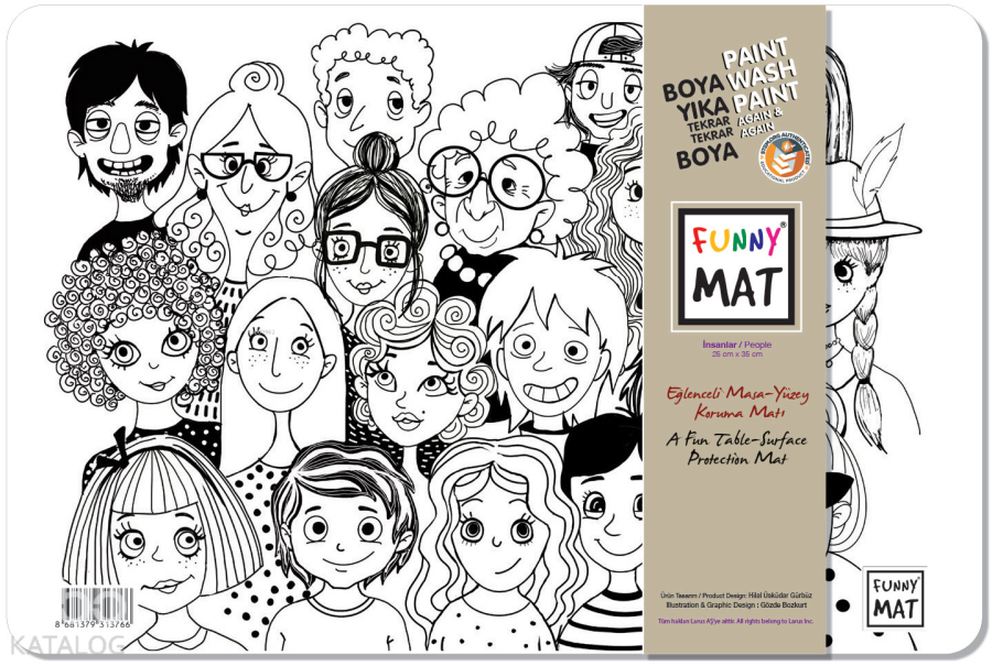 Funny Mat, 25x35 cm ölçüsünde her türlü etkinlik sırasında masa ve yüzey koruyucu olarak kullanılabilen bir üründür. Üzerinde yemek yenebilir, kil ve oyun hamuru ile oyun oynanabilir, ders çalışılabilir, boyama yapılabilir… Kendisi de bir etkinlik materyali olan Funny Mat'ın üzerindeki desenler hem keçeli kalemlerle hem de kuru boyalarla istenildiği gibi renklendirilebilir ve çocuklar bu sayede yaratıcılıklarını geliştirebilirler. Suyun altına tutulduğunda veya ıslak mendille silindiğinde kolaylıkla temizlenen Funny Mat, defalarca renklendirme ve aynı ürünü farklı amaçlarla kullanma imkânı vererek bütçe dostu bir ürün olma özelliği de taşımaktadır.