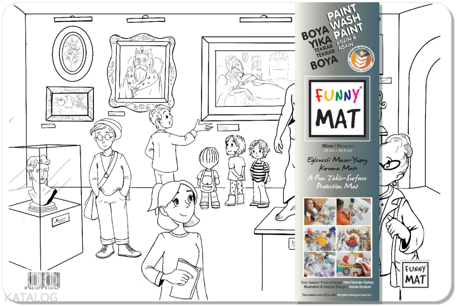 Funny Mat, 33,5x48 cm ölçüsünde her türlü etkinlik sırasında masa ve yüzey koruyucu olarak kullanılabilen bir üründür. Üzerinde yemek yenebilir, kil ve oyun hamuru ile oyun oynanabilir, ders çalışılabilir, boyama yapılabilir… Kendisi de bir etkinlik materyali olan Funny Mat'ın üzerindeki desenler hem keçeli kalemlerle hem de kuru boyalarla istenildiği gibi renklendirilebilir ve çocuklar bu sayede yaratıcılıklarını geliştirebilirler. Suyun altına tutulduğunda veya ıslak mendille silindiğinde kolaylıkla temizlenen Funny Mat, defalarca renklendirme ve aynı ürünü farklı amaçlarla kullanma imkânı vererek bütçe dostu bir ürün olma özelliği de taşımaktadır.