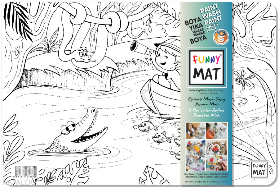 Funny Mat, 33,5x48 cm ölçüsünde her türlü etkinlik sırasında masa ve yüzey koruyucu olarak kullanılabilen bir üründür. Üzerinde yemek yenebilir, kil ve oyun hamuru ile oyun oynanabilir, ders çalışılabilir, boyama yapılabilir… Kendisi de bir etkinlik materyali olan Funny Mat'ın üzerindeki desenler hem keçeli kalemlerle hem de kuru boyalarla istenildiği gibi renklendirilebilir ve çocuklar bu sayede yaratıcılıklarını geliştirebilirler. Suyun altına tutulduğunda veya ıslak mendille silindiğinde kolaylıkla temizlenen Funny Mat, defalarca renklendirme ve aynı ürünü farklı amaçlarla kullanma imkânı vererek bütçe dostu bir ürün olma özelliği de taşımaktadır.