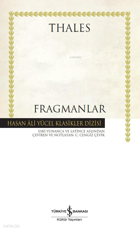 Thales (MÖ y. 650/639-548/544): Yunan matematikçi, filozof, astronom. Batı Anadolu'daki Miletos'ta yaşamış olan Thales, her şeyin kaynağının su olduğunu söylemiş, var oluşu mitolojiye değil, doğadaki bir unsura dayandırmasıyla sadece felsefenin değil, doğa araştırmalarının ve bilimin de öncüsü olmuştur. Antikçağ felsefe ve düşünce tarihinin önemli figürleri sayılan Yedi Bilge'den biridir. Gökbilim ve mühendislik alanındaki çalışmalarıyla dikkat çeken Thales, yaşadığı dönemin kanaat önderleri arasında da gösterilir. Diğer Presokratik filozoflar gibi, Thales'in eserleri de günümüze ulaşmamıştır. Kendisiyle ve düşünceleriyle ilgili bilgiler sonraki yazar ve filozofların eserlerinde bulunur. Fragmanlar çalışması filolojik ve akademik açıdan saygın fragman derlemelerinin rehberliğinde Thales'in biyografisi, doktrini ve alımlanmasıyla ilgili fragmanların çevirisini ve kapsamlı açıklamalarını içermektedir.