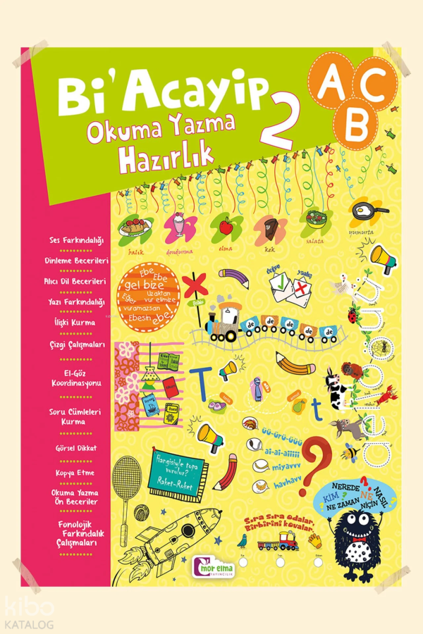 Bi' Acayip Okuma Yazma Hazırlık 2 kitabında; el-göz koordinasyonu, çizgi çalışmaları, ses farkındalığı, alıcı dil becerileri, görsel kopyalama, görsel dikkat, görsel ayırt etme, dinleme becerileri, okuma-yazma ön beceriler ve fonolojik farkındalık çalışmaları bulunmaktadır. Çocuğunuz hem eğlenecek hem de öğrenecek!