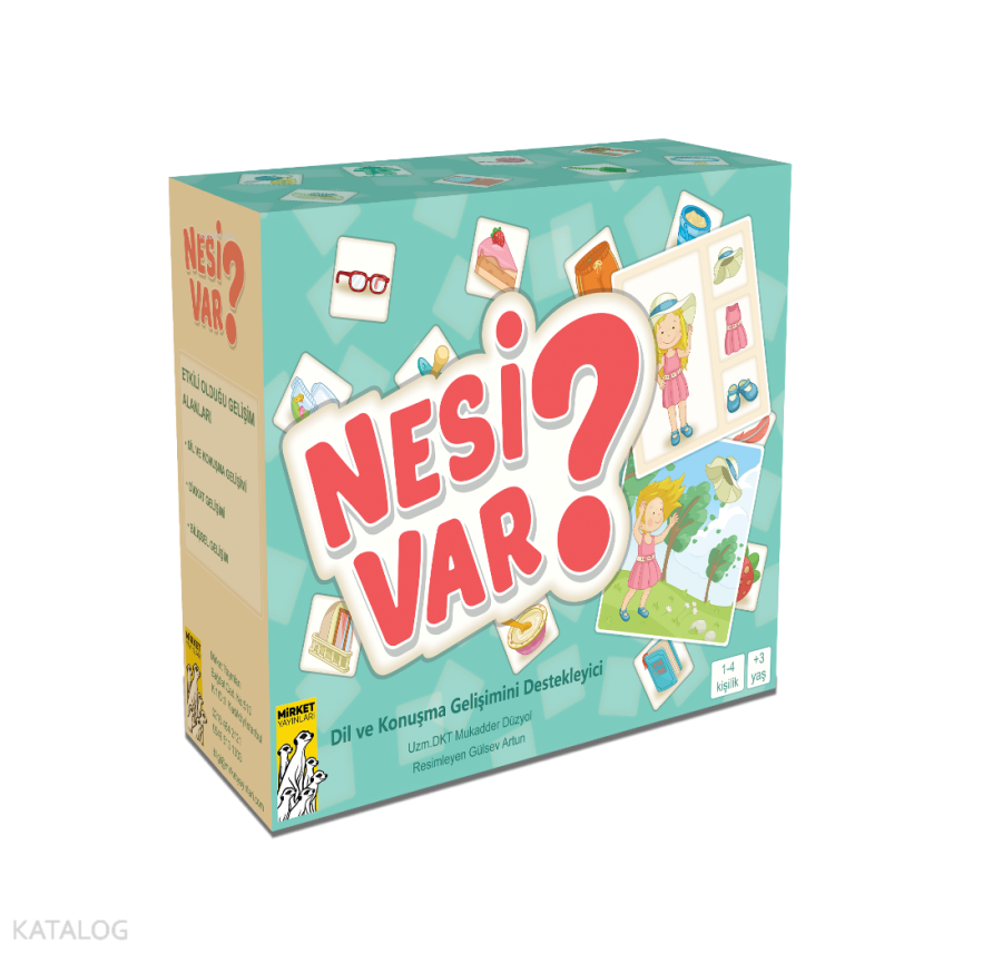 Nesi Var? oyunuyla çocukların; eşleme yapma becerisinin geliştirilmesi, dikkat becerilerinin arttırılması, tamlayan – tamlanan eklerinin cümle içinde kullanımının sağlanması hedeflenmiştir. Kutu oyunları ve kitaplarla çocuğunuzun dil-konuşma gelişimine katkıda bulunabilirsiniz. NESİ VAR? Dil ve konuşma gelişimi normal sınırlar içinde ilerleyen bir çocukta önce isimler sonra eylemler, sonra ise 2 öğeli basit cümleler gelişir. Devam eden süreçte çocuğun anlatımları zenginleşmeye başlar. Bu durum çoğunlukla eklerin konuşmaya dahil olması ve cümledeki öğelerin artışıyla görülür. Çocuğun parça-bütün ilişkisini kavramasıyla iyelik ve tamlayan ekini kullanması aynı döneme denk gelir. “Kuş tüy düştü” gibi bir cümle anlatımı eksik kılarken “kuşun tüyü düştü” cümlesinde anlatım daha açıktır. NESİ VAR? oyun kartlarıyla; tamlayan/tamlanan eklerinin kullanılması, aidiyet ilişkisine dikkat çekilmesi, eşleme yapma becerisinin geliştirilmesi, dikkat ve odaklanmanın arttırılması, eklerin cümle içinde kullanımının sağlanması hedeflenmiştir.